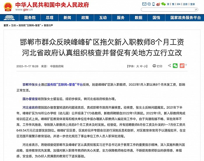 ·河北邯郸16所幼儿园拖欠新入职幼师8个月工资?官方:属实,已敦促补发649.54万元。