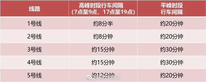 线路行车间隔如下表: