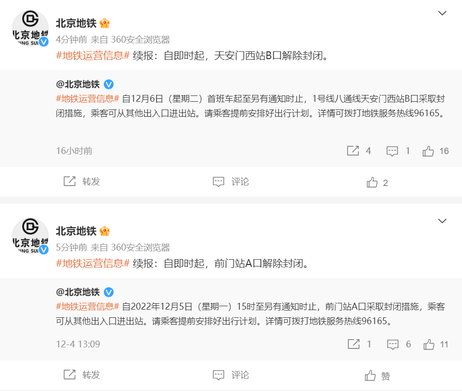 北京地铁:1号线八通线前门站A口、天安门西站B口解除封闭
