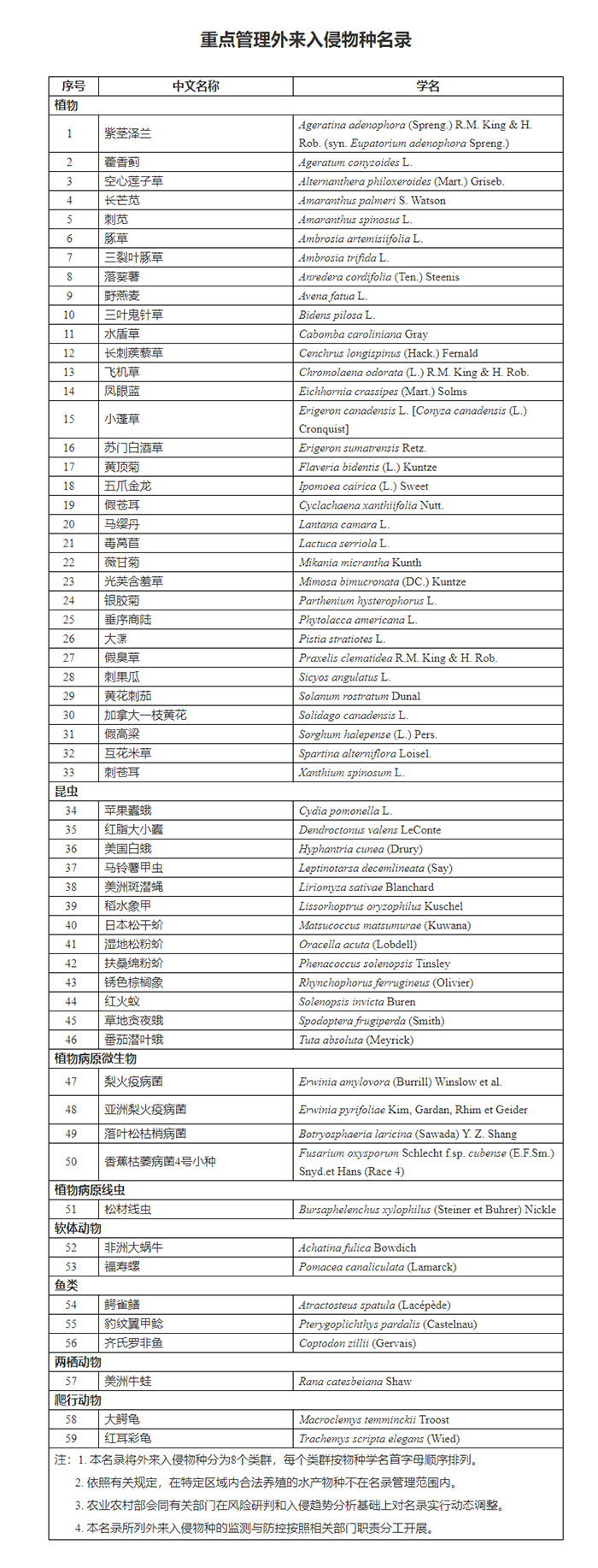 中新网12月20日电 据农业农村部网站20日消息,根据《中华人民共和国生物安全法》,农业农村部会同自然资源部、生态环境部、住房和城乡建设部、海关总署和国家林草局组织制定了《重点管理外来入侵物种名录》,包含鳄雀鳝、美洲牛蛙等59种外来入侵物种。《重点管理外来入侵物种名录》自2023年1月1日起施行。(中新财经)