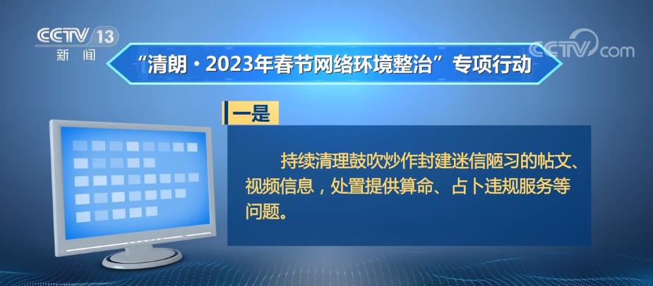 央视网消息:中央网信办1月18日起开展为期1个月的“清朗·2023年春节网络环境整治”专项行动。此次“清朗·2023年春节网络环境整治” 专项行动还将集中查处组织实施网络赌博等违法违规行为,以及重点加大未成年人保护力度。