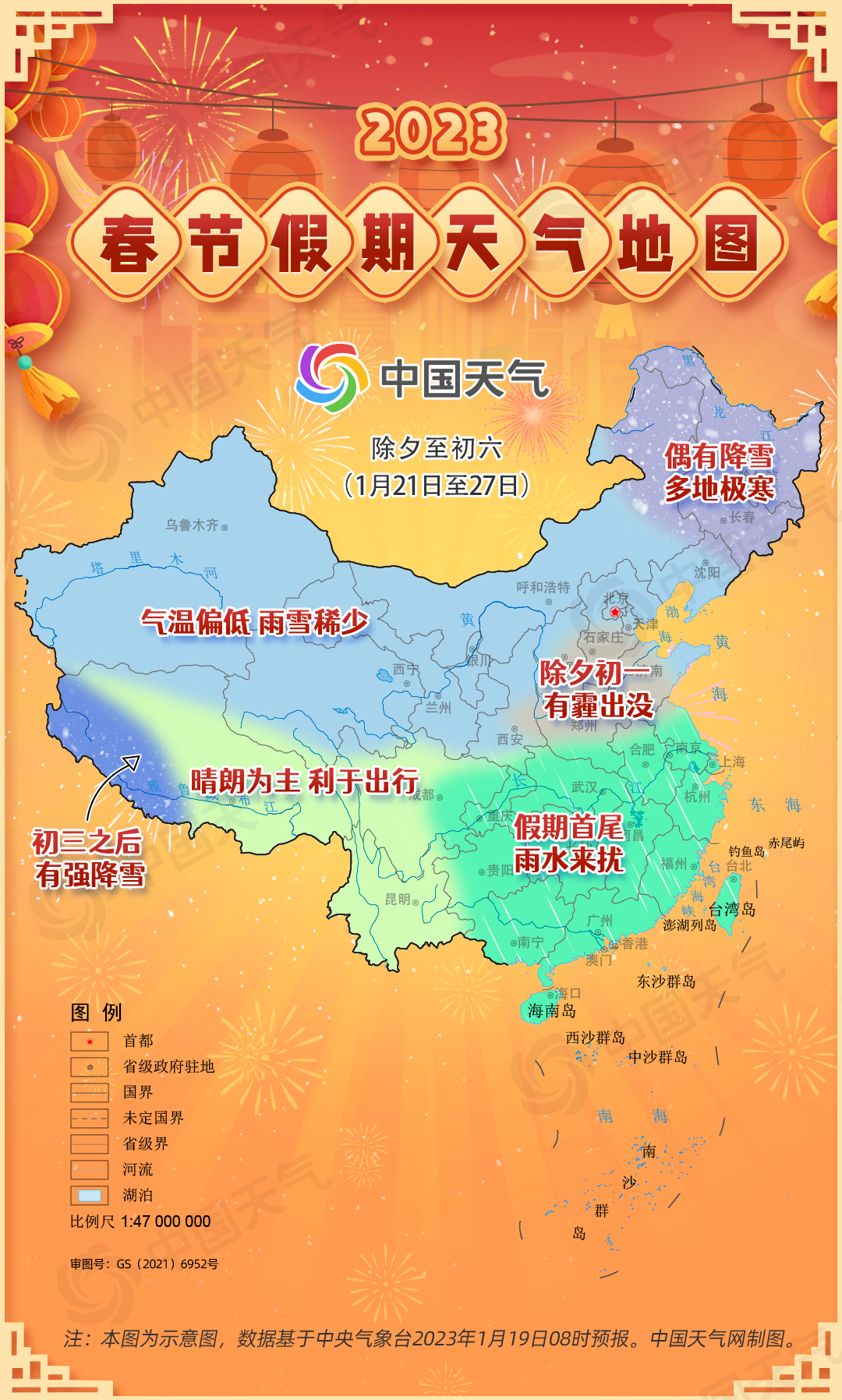 央视网消息:据中国天气网消息,今天(1月19日)上午,中央气象台正式发布春节假期天气预报,预计2023年春节假期(除夕至初六)我国无大范围低温雨雪冰冻等灾害天气,冷空气活动较为频繁,中东部地区气温波动较大,内蒙古东部、东北一带气温偏冷明显,部分地区将现极寒。南方多地雨水中迎新春,除夕、初一及初五前后会有阴雨,需注意出行安全。
