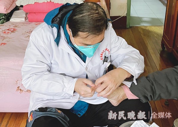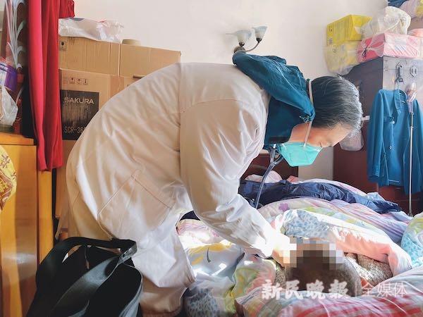 80岁的丁老伯和72岁的徐阿姨都是他的家床病人,认识严正20多年了。“老丁头发剪过啦?过年吃点啥小菜?”严正熟门熟路进入主卧。年前,丁老伯感染新冠后身子虚弱,摔了一跤,伤到了腰椎,只能卧床。他身体差,发生过心梗、脑梗,又有冠心病;徐阿姨是肢体残疾人士,有高血压、冠心病、骨髓炎,还有下肢静脉炎。女儿平时要上班,夫妻俩最大的依靠就是家庭医生。