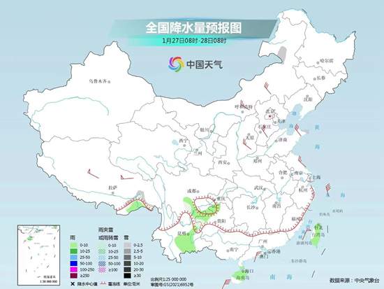 央视网消息:据中国天气网消息,今天(1月27日)迎来大年初六,春节假期接近尾声,冷空气依然在线,受其影响,中东部气温将持续偏低,云南降温剧烈,昆明最高气温一天或猛降20℃。由于水汽缺乏,今明天我国大部降水稀少,总体利于春运返程。