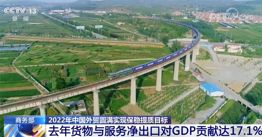 新贡献,从国内看,2022年货物与服务净出口对GDP的增长贡献率达到了17.1%,拉动GDP增长0.5个百分点。从国际看,在全球经贸环境动荡的大背景下,中国采取了有力措施,稳定生产、稳定出口,保障了全球产业链供应链畅通运转。