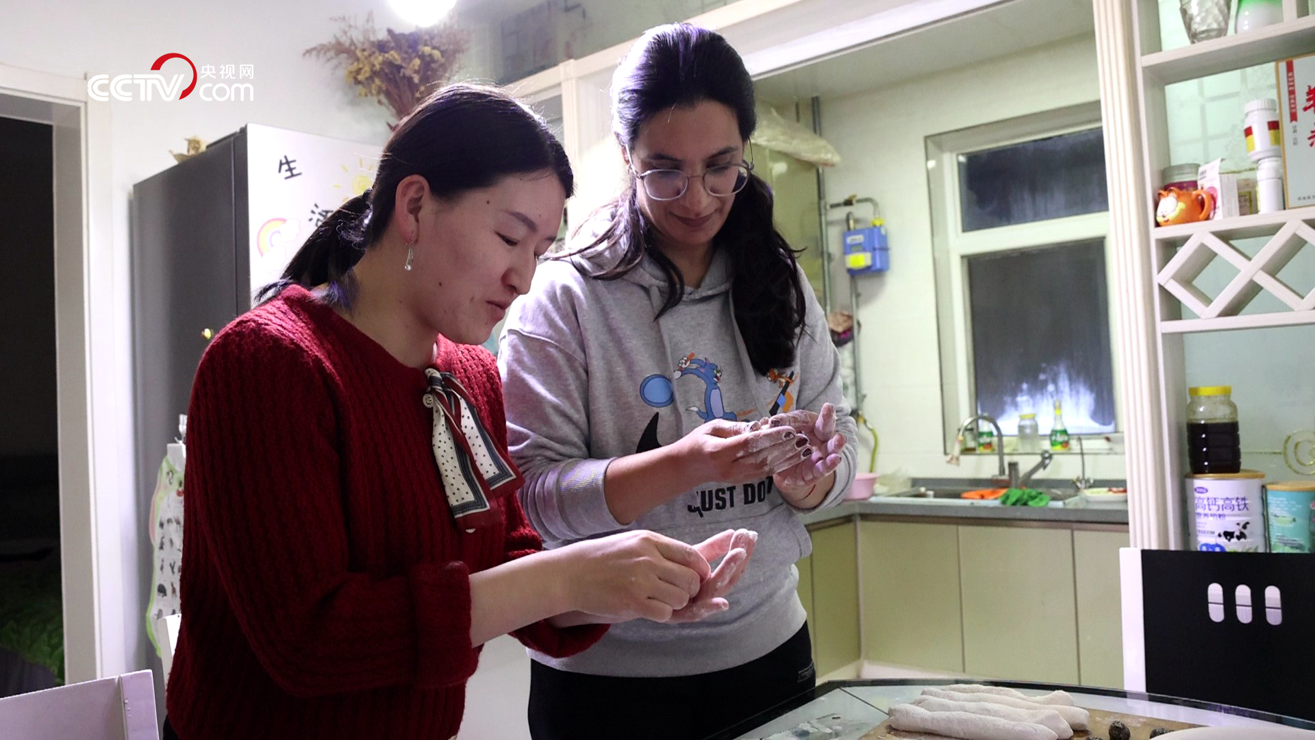 甘肃华池,来自摩洛哥的外教瑞秋喜爱中国传统文化,在这个喜庆的日子里,瑞秋被住在同小区的同事魏红艳邀请到家一起包汤圆,共庆佳节。(报道员 李旺发)
