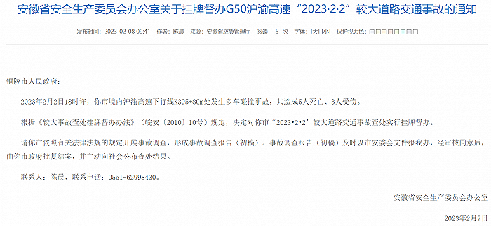 央视网消息:据安徽省应急管理厅网站2月8日消息,2月2日18时许,铜陵市境内沪渝高速下行线K395+80m处发生多车碰撞事故,共造成5人死亡、3人受伤。根据《较大事故查处挂牌督办办法》(皖安〔2010〕10号)规定,安徽省安全生产委员会办公室决定对铜陵市“2023·2·2”较大道路交通事故查处实行挂牌督办。