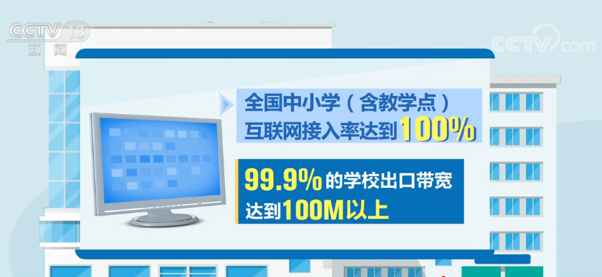 目前,全国中小学(含教学点)互联网接入率达到100%,99.9%的学校出口带宽达到100M以上,超过四分之三的学校实现无线网络覆盖,99.5%的学校拥有多媒体教室。数字化教学条件的不断改善有效助力了城乡教育的均衡发展。