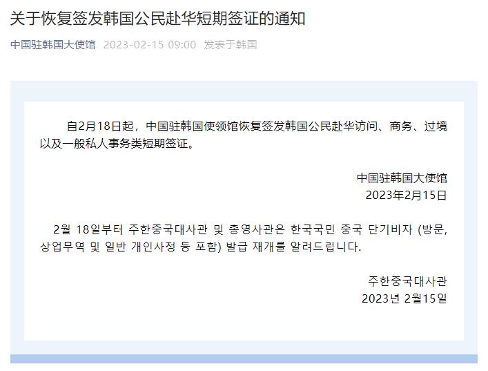 :据“中国驻韩国大使馆”微信公众号消息,自2月18日起,中国驻韩国使领馆恢复签发韩国公民赴华访问、商务、过境以及一般私人事务类短期签证。