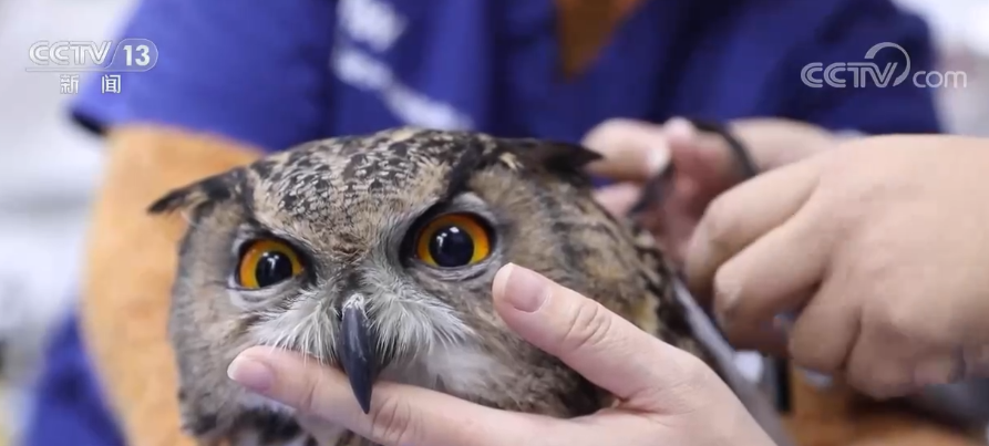 在野外放归前,北京猛禽救助中心对雕鸮进行了细致检查。