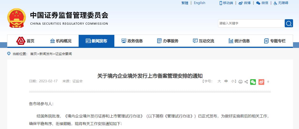 央视网消息:2月17日,中国证监会发布《关于境内企业境外发行上市备案管理安排的通知》。具体内容如下: