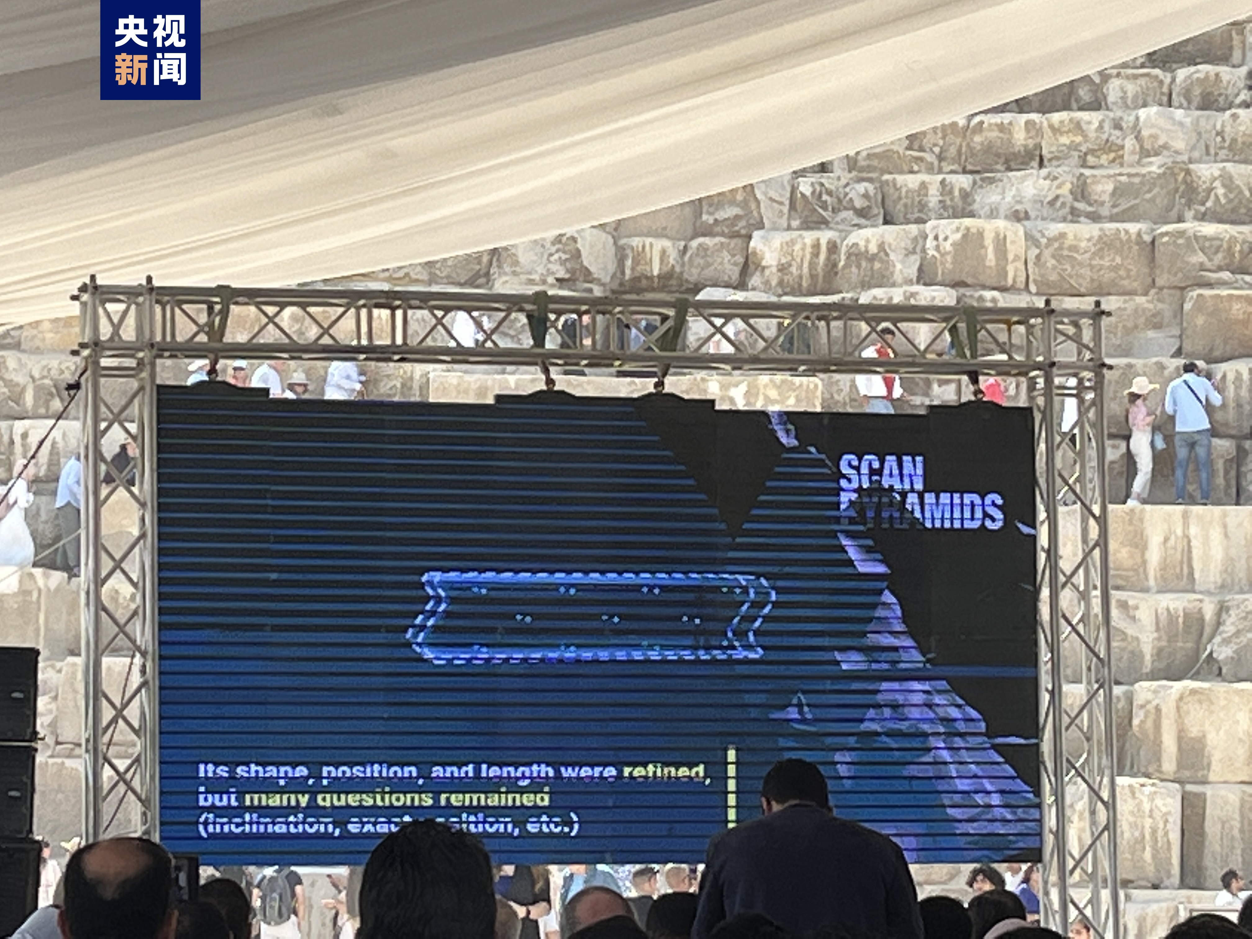 在当天于胡夫金字塔前举行的记者会上,埃及旅游和文物部长伊萨表示“扫描金字塔”项目团队通过粒子物理学探测方法在胡夫金字塔内发现了一条长9米、宽2.1米的新通道。