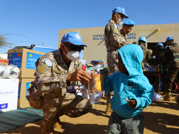 2022年11月9日,中国第十批赴马里维和工兵分队副分队长卞龙给当地儿童送慰问品。葛学禹摄