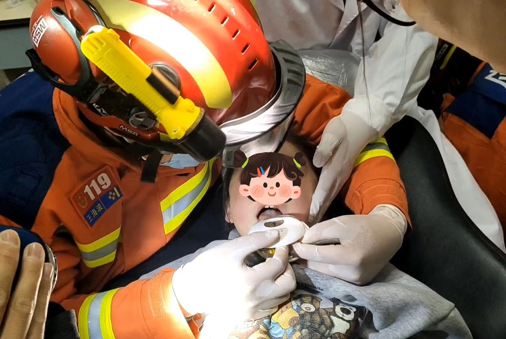 ·合肥一女童舌头被卷入电动指甲刀,消防人员配合医生紧急救援。