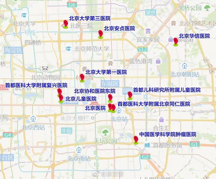 工作日白天时段,预计儿童医院、儿研所、北京医院、西苑医院、复兴医院、北医三院、同仁医院、积水潭医院等医院门前及周边道路车流量较大,高峰时段预计为7至13时。