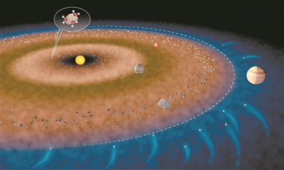 图中的白色虚线显示了内太阳系和外太阳系之间的边界,小行星带大致位于火星和木星之间。图像顶部附近的气泡显示水分子附着在岩石碎片上,表明可能将水带到地球的物体类型。