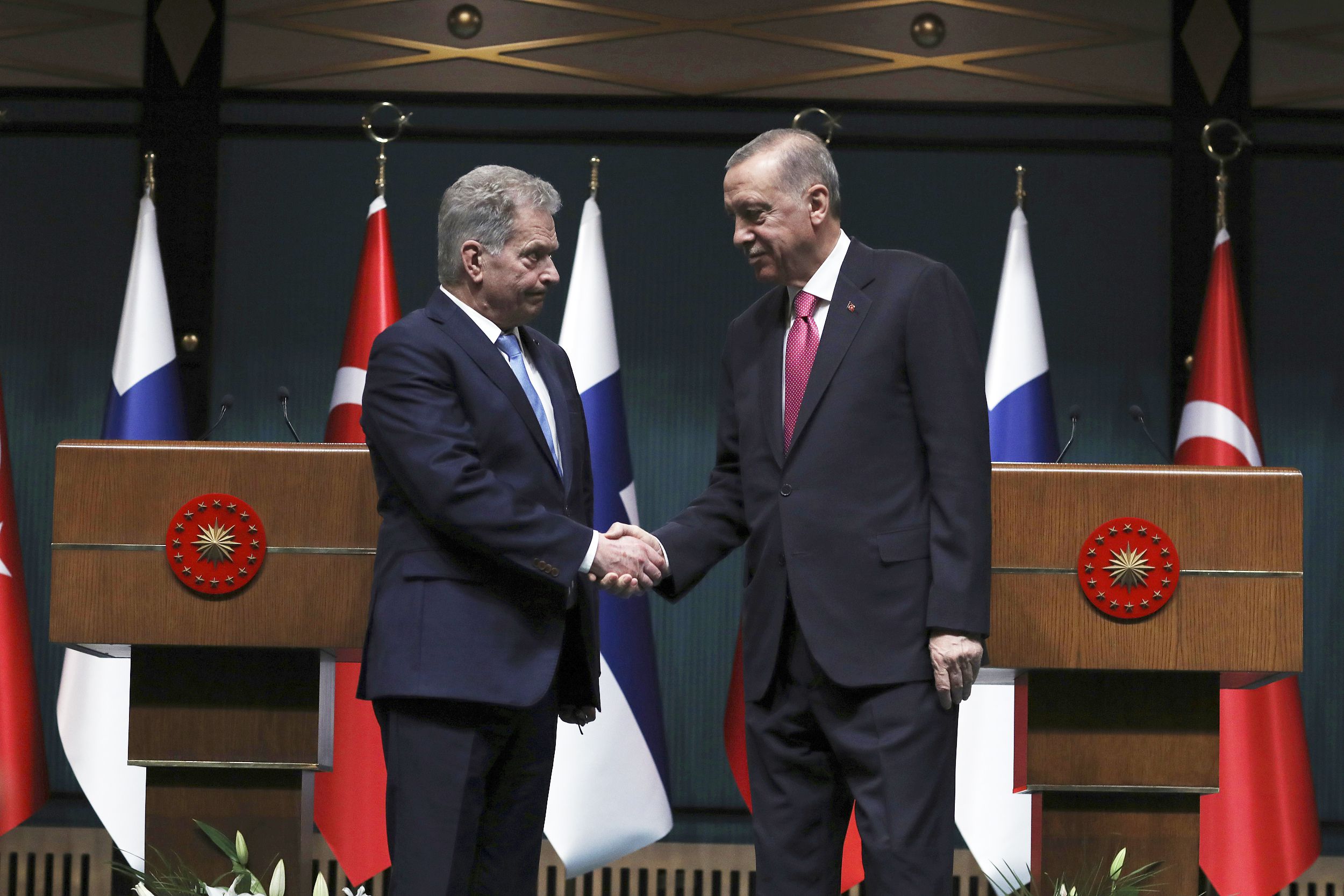 当地时间2023年3月17日,土耳其安卡拉,土耳其总统埃尔多安(右)和芬兰总统尼尼斯托在安卡拉总统府举行新闻发布会后握手。土耳其的批准将扫清芬兰加入北约的最后障碍。 视觉中国 图