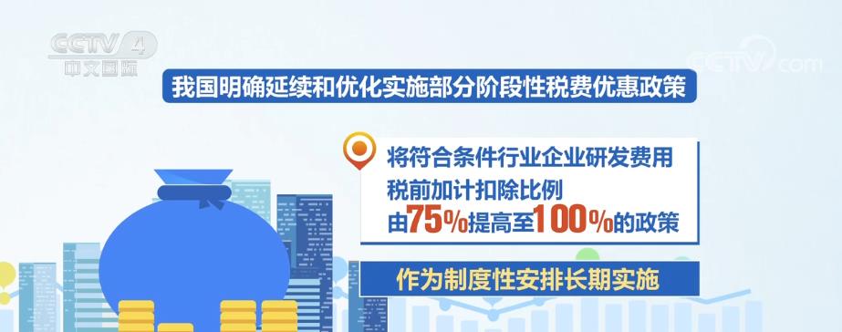 将符合条件行业企业研发费用税前加计扣除比例由75%提高至100%的政策,作为制度性安排长期实施。