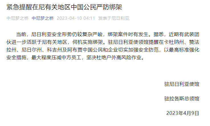 央视网消息:据中国驻尼日利亚大使馆微信公众号消息,驻尼日利亚使馆和驻拉各斯总领馆10日发布紧急提醒,提醒在尼有关地区中国公民严防绑架。当前,尼日利亚安全形势仍较复杂严峻,绑架案件时有发生。据悉,近期有武装团伙进一步活跃于尼有关地区,伺机实施绑架。驻尼日利亚使领馆提醒在卡杜纳州、赞法拉州、尼日尔州、科吉州及阿布贾中国公民和企业切实加强安全防范,以最高标准强化安全措施,最大程度压减中方员工,坚决杜绝户外高风险作业。