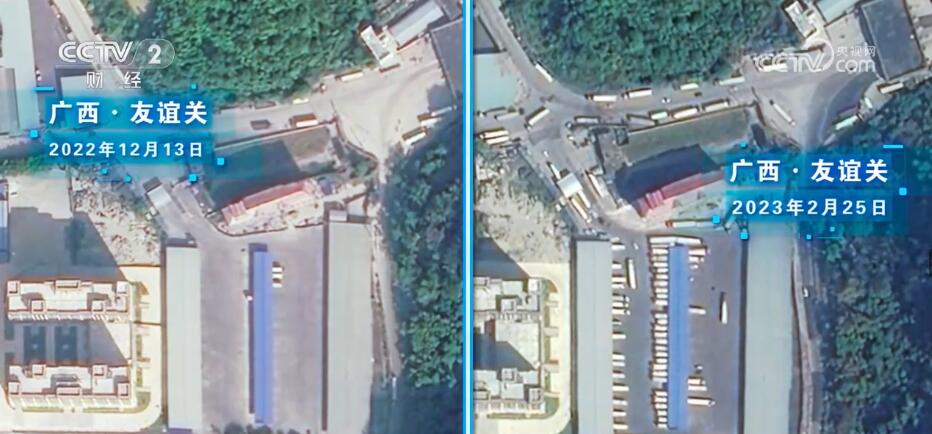 这里是广西凭祥友谊关附近的边境检查站和边贸货物监管中心。从去年12月中旬的卫星影像画面中可以看出,口岸附近的货场比较空旷,几条主要道路上也没有几辆车。而今年2月25日的卫星影像画面显示,在距离口岸3公里的保税物流区内,路边出现了临时停放的车辆,市场里也有许多集装箱车辆在此停靠,装卸货物。两个时间段影像对比,可以看出边境贸易活跃度的提升。数据显示,今年以来,友谊关出入境边防检查站共检查出入境车辆12.66万辆次,较去年同期增长169.9%。