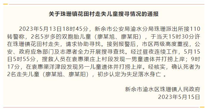央视网消息:据“新余发布”微信公众号消息,新余市渝水区珠珊镇人民政府发布《关于珠珊镇花田村走失儿童搜寻情况的通报》:5月13日18时45分,新余市公安局渝水分局珠珊派出所接110转警称,2名5岁多的双胞胎儿童(廖某旭、廖某阳),于当天15时30分许在珠珊镇花田村走失,请求协助寻找。接到报警后,市区两级高度重视,公安、政府应急部门及志愿者全力开展搜寻查找。经过昼夜连续工作,5月15日5时55分,搜救人员在袁惠渠庄上村段发现一男童遗体并打捞上岸;9时17分,在袁惠渠洋津段发现另一儿童遗体并打捞上岸。经核实,确认死者为2名走失儿童(廖某旭、廖某阳),初步认定为失足落水身亡 。