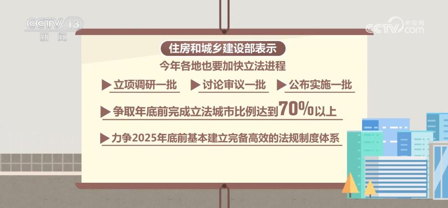 住房城乡建设部表示,2023年,各地也要加快立法进程,立项调研一批、讨论审议一批、公布实施一批,争取年底前完成立法城市比例达到70%以上,力争2025年底前基本建立完备高效的法规制度体系。