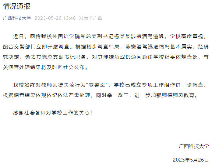 5月26日,广西科技大学通报:近日,网传我校外国语学院党总支副书记杨某某涉嫌酒驾逃逸,学校高度重视,配合交警部门立即开展调查。根据初步调查结果,涉嫌酒驾逃逸情况基本属实。经研究决定,免去其党总支副书记职务,对其涉嫌酒驾逃逸问题由学校纪委依规查处,有关调查处理结果将及时向社会公布。我校始终对教师师德失范行为“零容忍”,学校已成立专项工作组作进一步调查,根据调查结果依规依纪依法严肃处理,同时举一反三,进一步加强师德师风教育。