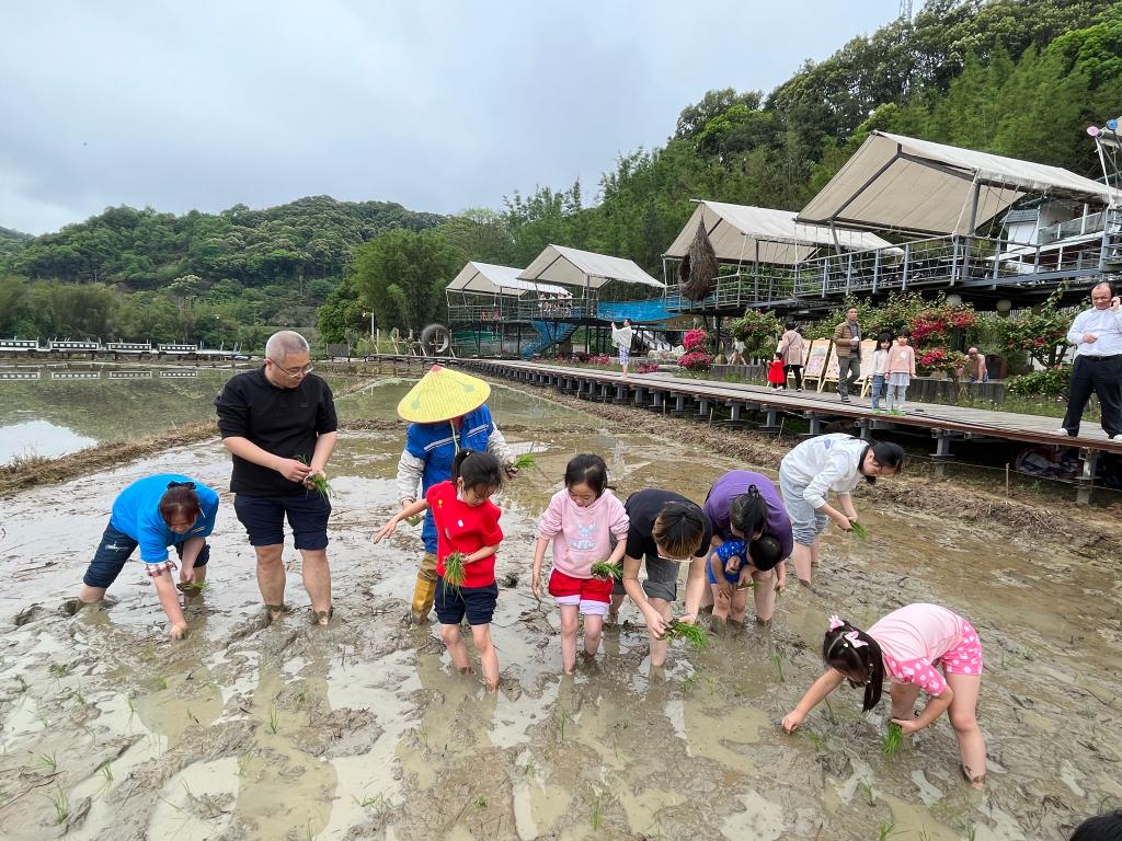 2023年4月,孩子们在广州市从化区良口镇米埗村体验农耕插秧研学活动。(冯志威 摄)