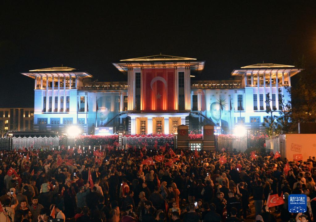 5月28日晚,土耳其总统埃尔多安的支持者在位于安卡拉的总统府前庆祝。新华社发(穆斯塔法·卡亚摄)