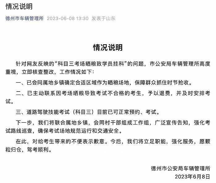 正在阅读:德州车管所回应“科目三考场晒粮致学员挂科”:予以退费,并及时安排考试