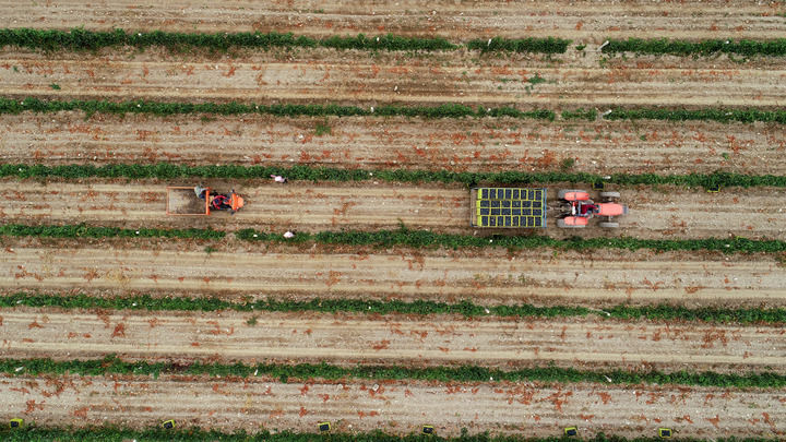 2022年9月17日,工人在宁夏银川市贺兰山东麓的沃尔丰酒庄采摘酿酒葡萄(无人机照片)。新华社记者 王鹏 摄