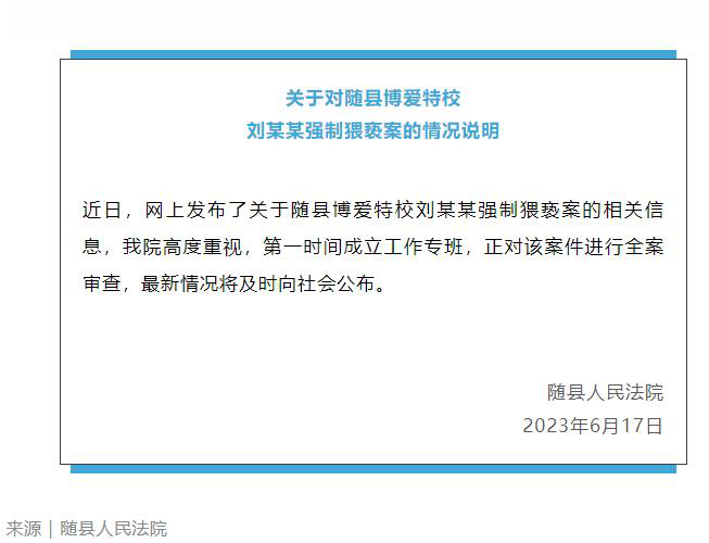 ·近日,网上发布了关于随县博爱特校刘某某强制猥亵案的相关信息,官方回应:第一时间成立工作专班,正对该案件进行全案审查,最新情况将及时向社会公布。