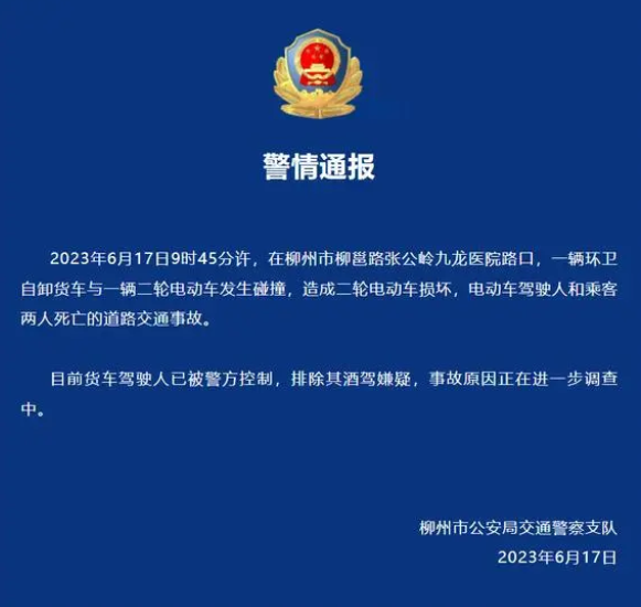 ·广西柳州一环卫货车与二轮电动车发生碰撞,致2人死亡。