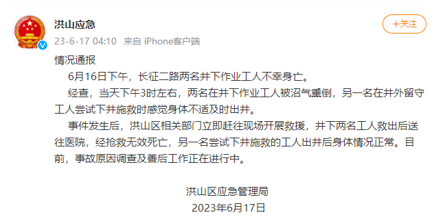 ·武汉洪山区:2名井下作业工人被沼气熏倒,经抢救无效死亡。