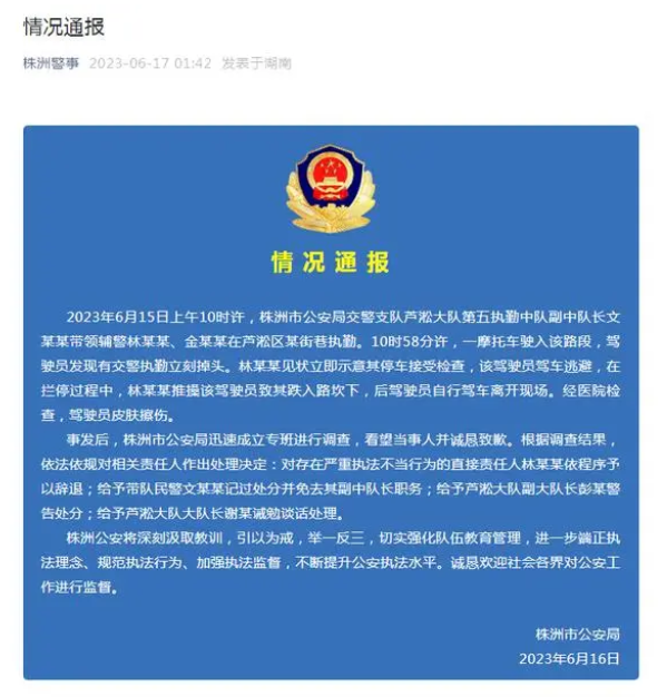 ·湖南株洲通报“执勤交警推搡驾驶员致其跌入路坎”:依法依规对相关责任人作出处理。