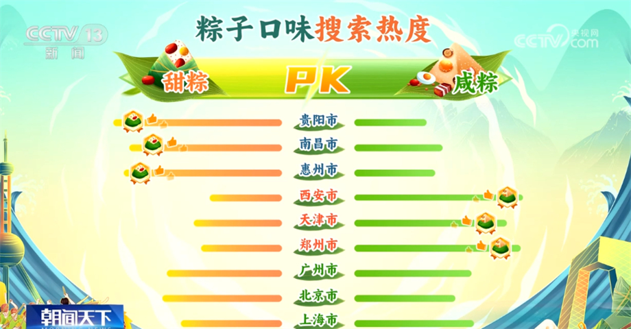 大数据分析发现,对粽子口味的选择正随着文化融合以及粽子种类的创新不断发生着变化:贵阳、南昌、惠州等南方城市对甜粽子的偏好度更高;而西安、天津、郑州等北方城市对咸粽子的偏好度更高;广州、北京、上海等城市融合了甜咸粽子口味,端午特色粽子文化在不断传承和发展中越来越丰富多彩。