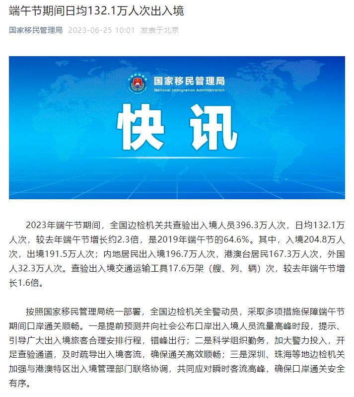 正在阅读:国家移民管理局:端午节期间日均132.1万人次出入境