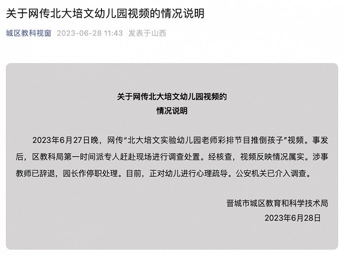 央视网消息:6月28日,山西晋城市城区教育和科学技术局发布“关于网传北大培文幼儿园视频的情况说明”:6月27日晚,网传“北大培文实验幼儿园老师彩排节目推倒孩子”视频。事发后,区教科局第一时间派专人赶赴现场进行调查处置。经核查,视频反映情况属实。涉事教师已辞退,园长作停职处理。目前,正对幼儿进行心理疏导。公安机关已介入调查。