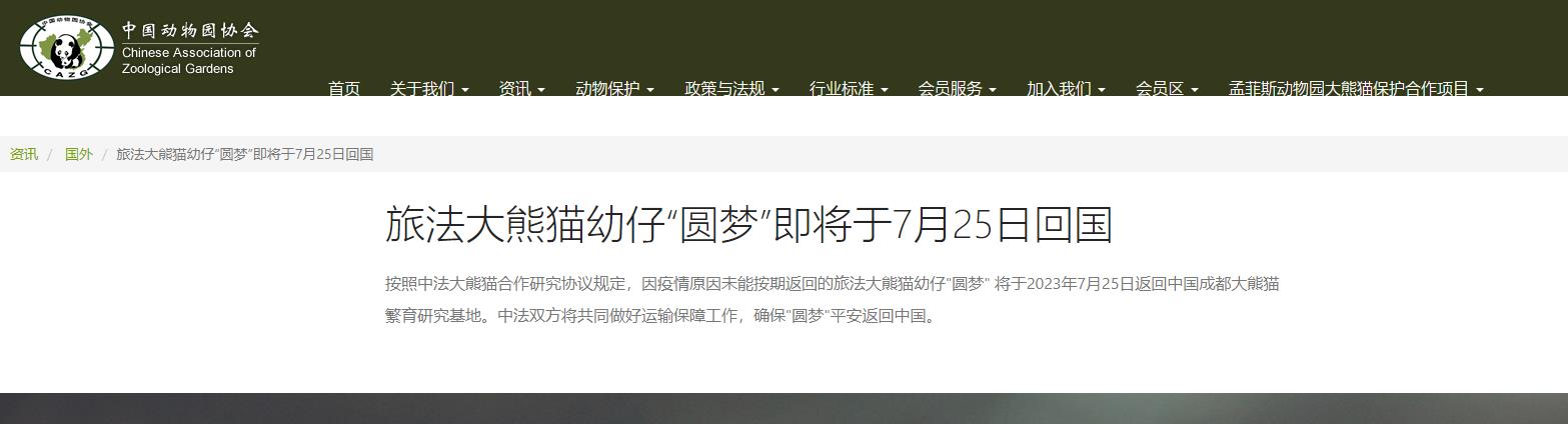 央视网消息:据中国动物园协会网站消息,按照中法大熊猫合作研究协议规定,因疫情原因未能按期返回的旅法大熊猫幼仔"圆梦" 将于2023年7月25日返回中国成都大熊猫繁育研究基地。中法双方将共同做好运输保障工作,确保"圆梦"平安返回中国。