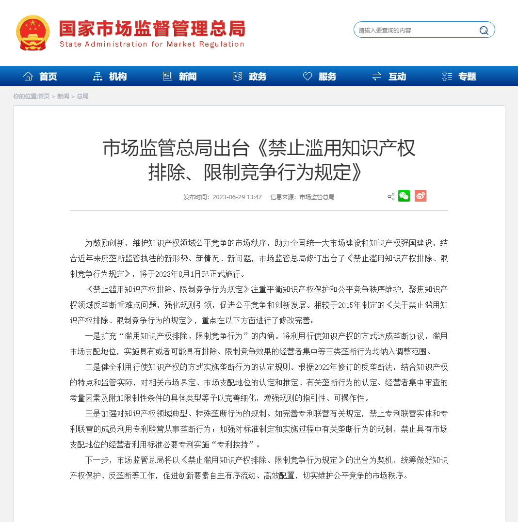 正在阅读:市场监管总局出台《禁止滥用知识产权排除、限制竞争行为规定》