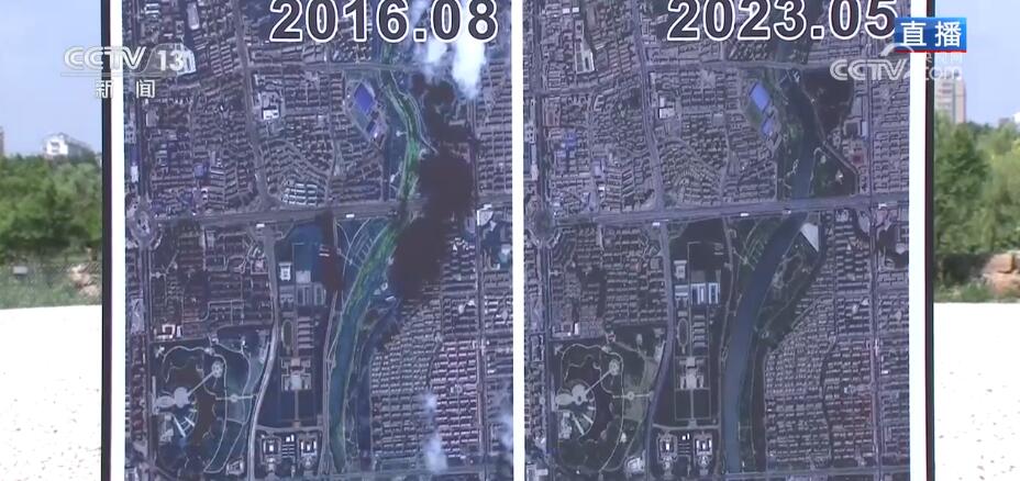 通过长达7年多的持续综合治理,伊通河的改变究竟有多大?来看这两张卫星图的对比。这是吉林一号卫星分别拍摄于2016年8月和2023年5月的伊通河卫星影像。首先看,2016年还没有进行大规模改造、清淤之前,河水中这些明显的绿色物质是恶劣水质下大肆生长出的藻类和杂草,几乎覆盖了整个水面。再看2023年5月的图像,河水呈现出淡蓝色,河道两侧干净、通畅,之前大面积裸露黄土的河岸,也变成了绿地和公园,改变非常明显。