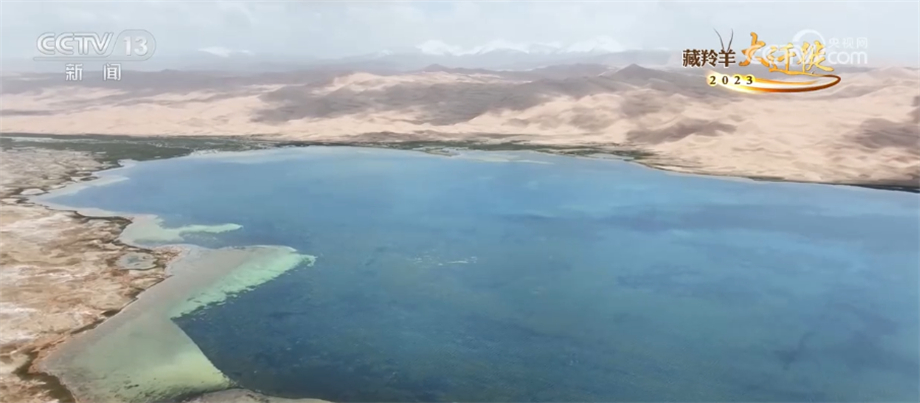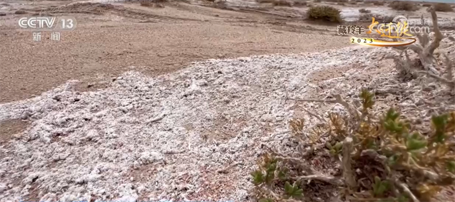 总台记者 崔宁:你看这个盐碱地上长的是典型的沙漠性植物,然后一路盐碱,到前面就是浩瀚的阿雅克库木湖。这是阿尔金山最大的湖泊,这儿的海拔有4300米左右,所以我们在这个镜头当中就看到特别奇特的景象,植物、盐碱、盐花、水、大片大片的湖泊,非常神奇。