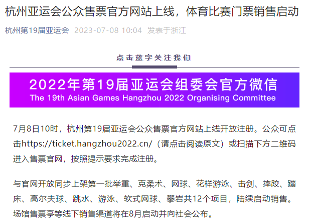 7月8日10时,杭州第19届亚运会公众售票官方网站上线开放注册。