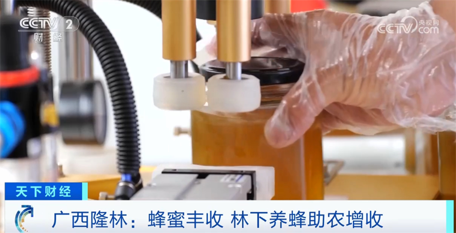 在广西隆林各族自治县金钟山乡弄八村养蜂基地,记者看到,郁郁葱葱的森林里蜂箱错落有致,成群的蜜蜂交织飞舞,蜂农正戴着防蜂帽收割蜂蜜。