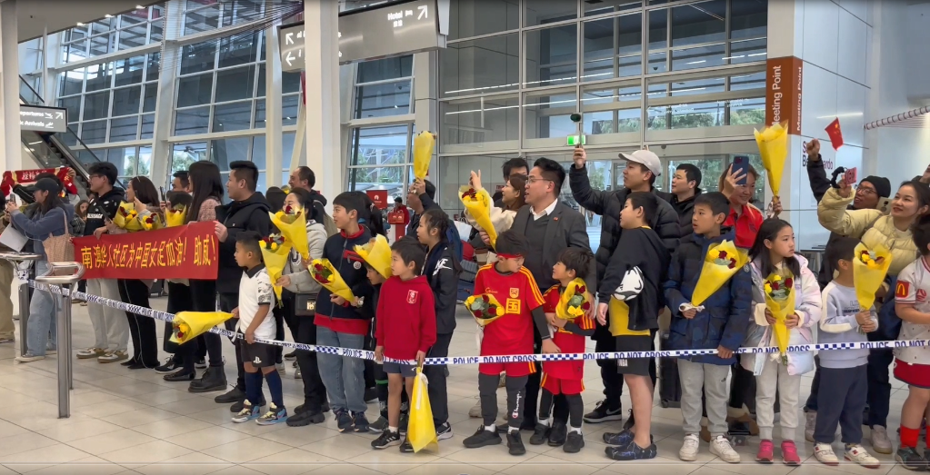 当天一早,正值冬季的阿德莱德下起了雨,增添一丝寒意。早7点左右,100多名当地民众等候在阿德莱德机场内,有的手捧鲜花,有的身穿中国队T恤,等待中国女足的到来。他们中一些人来自当地华人社团,其中不少家长带着小朋友一早赶来,还有的是球迷。