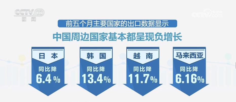 当记者查阅主要国家前5个月的进口数据时发现,主要国家进口额普遍下降,全球需求不振持续显现。而前5个月主要国家的出口数据也显示,中国周边国家基本都呈现负增长,日本同比降6.4%、韩国同比降13.4%、越南同比降11.7%、马来西亚同比降6.16%。