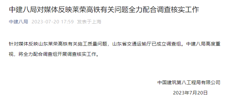 针对媒体反映山东莱荣高铁有关施工质量问题,山东省交通运输厅已成立调查组。中建八局高度重视,将全力配合调查组开展调查核实工作。