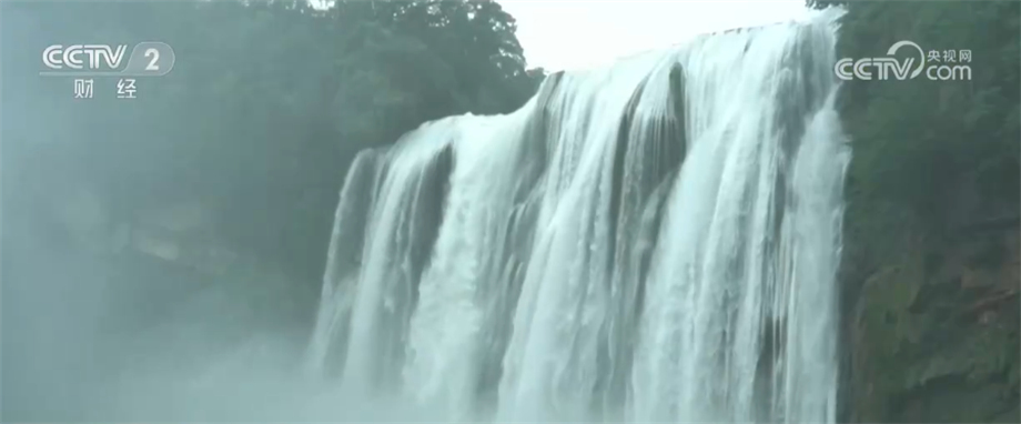 贵州台记者 龙静宜:现在黄果树瀑布的水量非常充足,也是受到了持续降雨和上游来水的影响,倾泻而下的瀑布水势非常浩大,升腾而起的水汽,我现在离它100多米都能够感觉到水汽在我身旁弥漫。