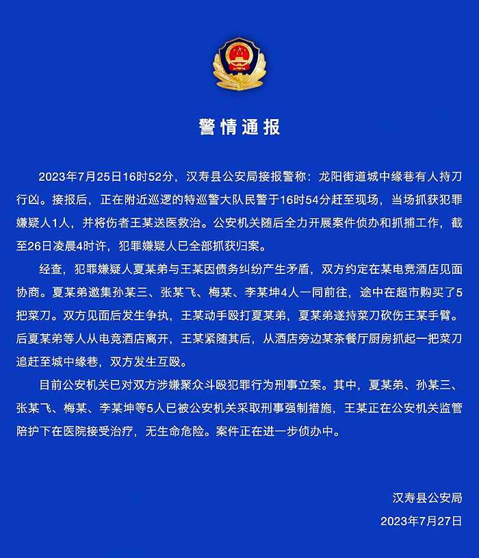 ·湖南汉寿警方通报“多人当街持刀互砍”:债务问题引发,已刑事立案。