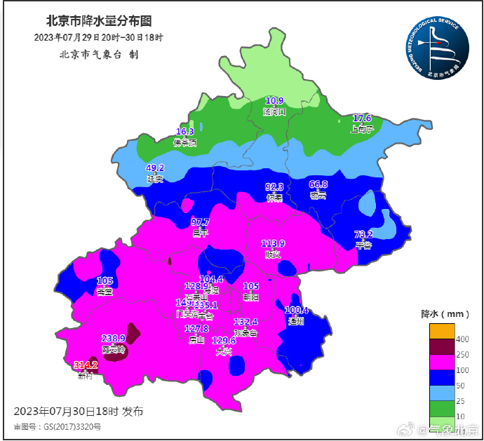 央视网消息:据@气象北京 微博消息,北京市气象台发布29日20时至30日18时降水量(毫米):全市平均99.4,城区平均(朝,海,丰,石,东,西)117.5,西南(门,房)157.5,东南(通,大)102.1,西北(延,昌)66.6,东北(密,顺,平,怀)61.1;城区最大丰台千灵山179.9,全市最大房山新村314.2,最大小时降水强度房山新村50.8毫米/小时(30日16时-17时)。